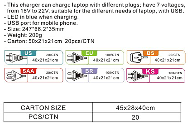 輸出:60W MAX DC 15V/16V/18V/19V/20V/22V