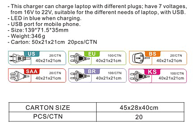 輸出:120W MAX DC 15V/16V/18V/19V/20V/22V